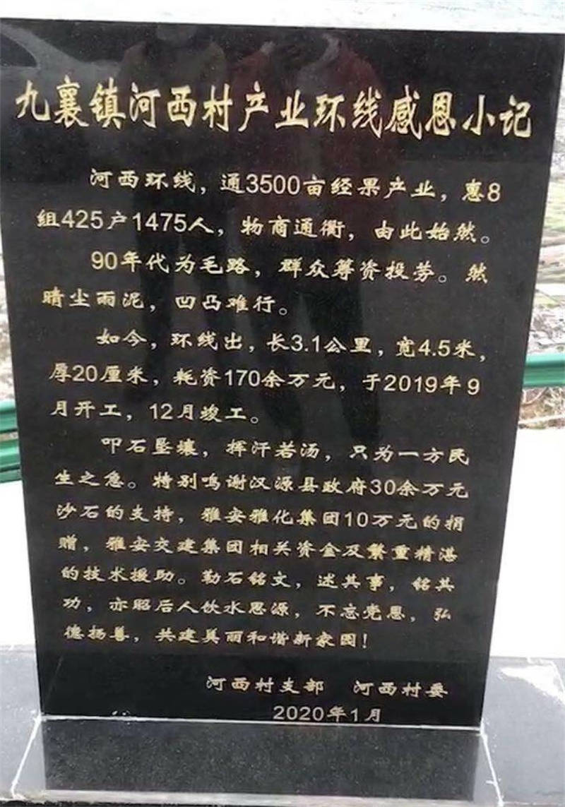 近期,漢源縣九襄鎮(zhèn)河西村勒石銘文,撰寫“九襄鎮(zhèn)河西村產(chǎn)業(yè)環(huán)線感恩小記”,以紀(jì)念該村水泥環(huán)線公路竣工通車。