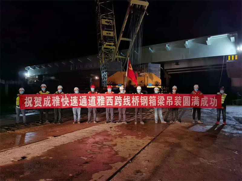 雅西跨線橋是成雅快速通道(雅安段)新建工程重要組成部分,該橋?yàn)閱慰绾喼т撓淞簶,全橋設(shè)計鋼箱梁4片,單片重量約140噸、長55余米,體積大、自身重、運(yùn)輸困難,且投入的大型機(jī)械設(shè)備較多,施工組織難度大。為順利完成架設(shè)任務(wù),市交通局會同市交建集團(tuán)、交建項(xiàng)目管理公司、市公安局交警支隊(duì)和各參建單位多次組織召開專題會議,提前謀劃、細(xì)致安排、優(yōu)化組織,制定了施工專項(xiàng)方案和應(yīng)急措施,使整個施工過程按照標(biāo)準(zhǔn)化、程序化、規(guī)范化進(jìn)行施工,為鋼箱梁的成功吊裝奠定了堅(jiān)實(shí)的基礎(chǔ)。
