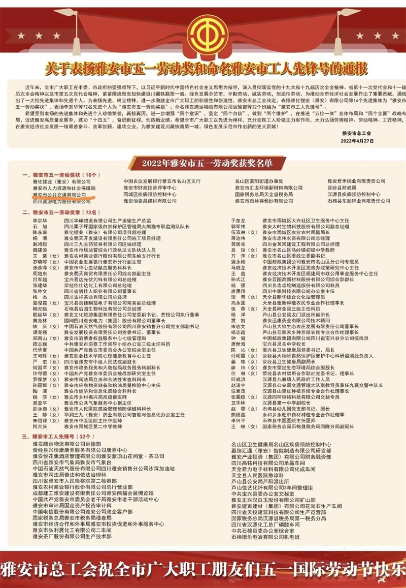4月28日,市總工會(huì)召開2022年雅安市慶祝“五一”國(guó)際勞動(dòng)節(jié)暨表?yè)P(yáng)大會(huì),交建集團(tuán)雅安市公共交通有限公司榮獲全市五一勞動(dòng)獎(jiǎng)狀殊榮。