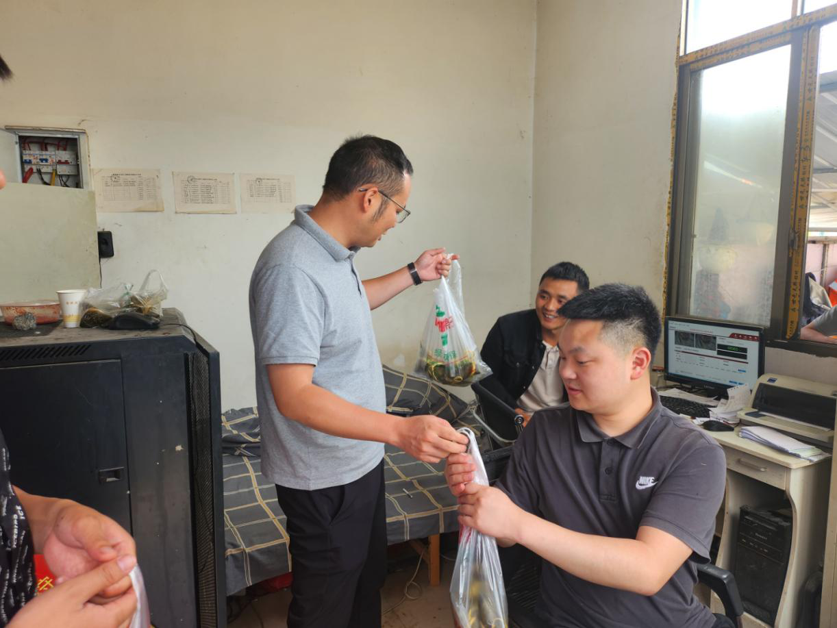公司食堂內(nèi),歡聲笑語一片!大家通力合作,在廚房阿姨的教學(xué)下包出一個(gè)個(gè)清香軟糯的愛心粽子,一起品嘗分享,整個(gè)活動(dòng)過程洋溢著祥和歡快的節(jié)日氛圍。為讓堅(jiān)守在代碑寺項(xiàng)目一線崗位的員工感受到組織的溫暖,隨后,公司總經(jīng)理張忠強(qiáng)帶隊(duì)奔赴代碑寺項(xiàng)目一線崗位,將包好的粽子送到員工手中,并送去節(jié)日的祝福。