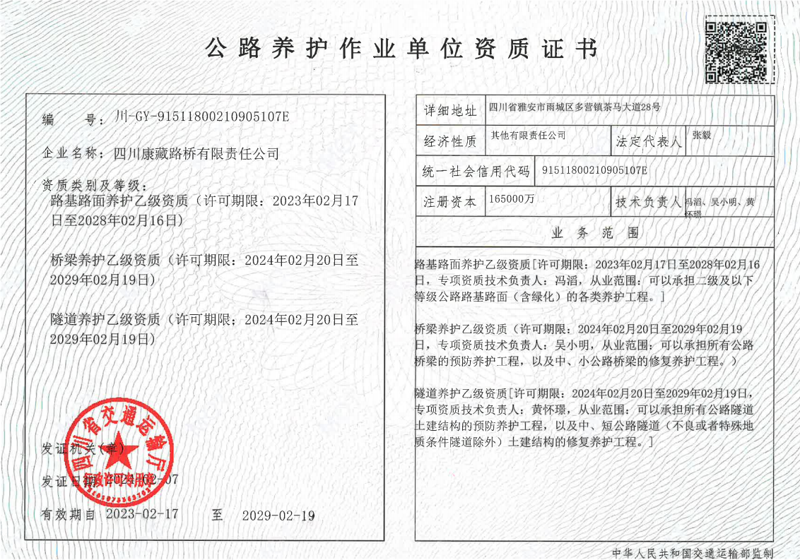 近日,雅安市交通建設(shè)(集團)有限責(zé)任公司通過自主申報,成功通過四川省交通運輸廳公路養(yǎng)護作業(yè)單位資質(zhì)評審,完成公路養(yǎng)護作業(yè)單位資質(zhì)增項,新增橋梁養(yǎng)護乙級、隧道養(yǎng)護乙級兩項資質(zhì)。
