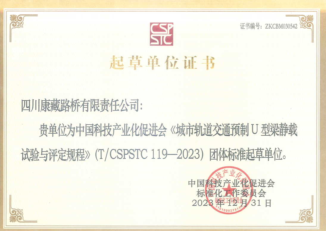 日前,雅安市交通建設(shè)(集團(tuán))有限責(zé)任公司收到中國科技產(chǎn)業(yè)化促進(jìn)會(huì)頒發(fā)的《城市軌道交通預(yù)制U型梁靜載試驗(yàn)與評(píng)定規(guī)程》(T/CSPSTC119-2023)團(tuán)體標(biāo)準(zhǔn)起草單位證書,路橋公司參與起草的《城市軌道交通預(yù)制U型梁靜載試驗(yàn)與評(píng)定規(guī)程》團(tuán)體標(biāo)準(zhǔn),于2023年12月31日正式發(fā)布實(shí)施。