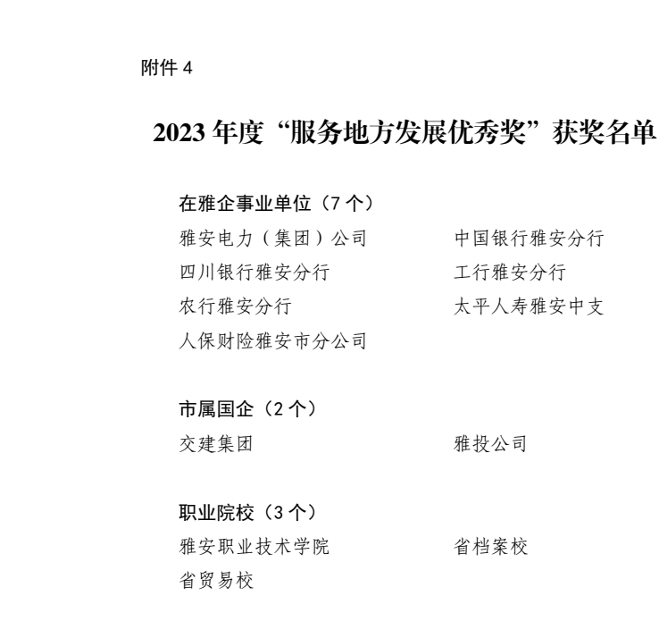 近日,中共雅安市委辦公室、雅安市人民政府辦公室印發(fā)《關(guān)于2023年度縣(區(qū))、市級(jí)部門和單列考評單位目標(biāo)績效綜合考評結(jié)果的通報(bào)》,雅安交建集團(tuán)獲得2023年度“服務(wù)地方發(fā)展優(yōu)秀獎(jiǎng)”。