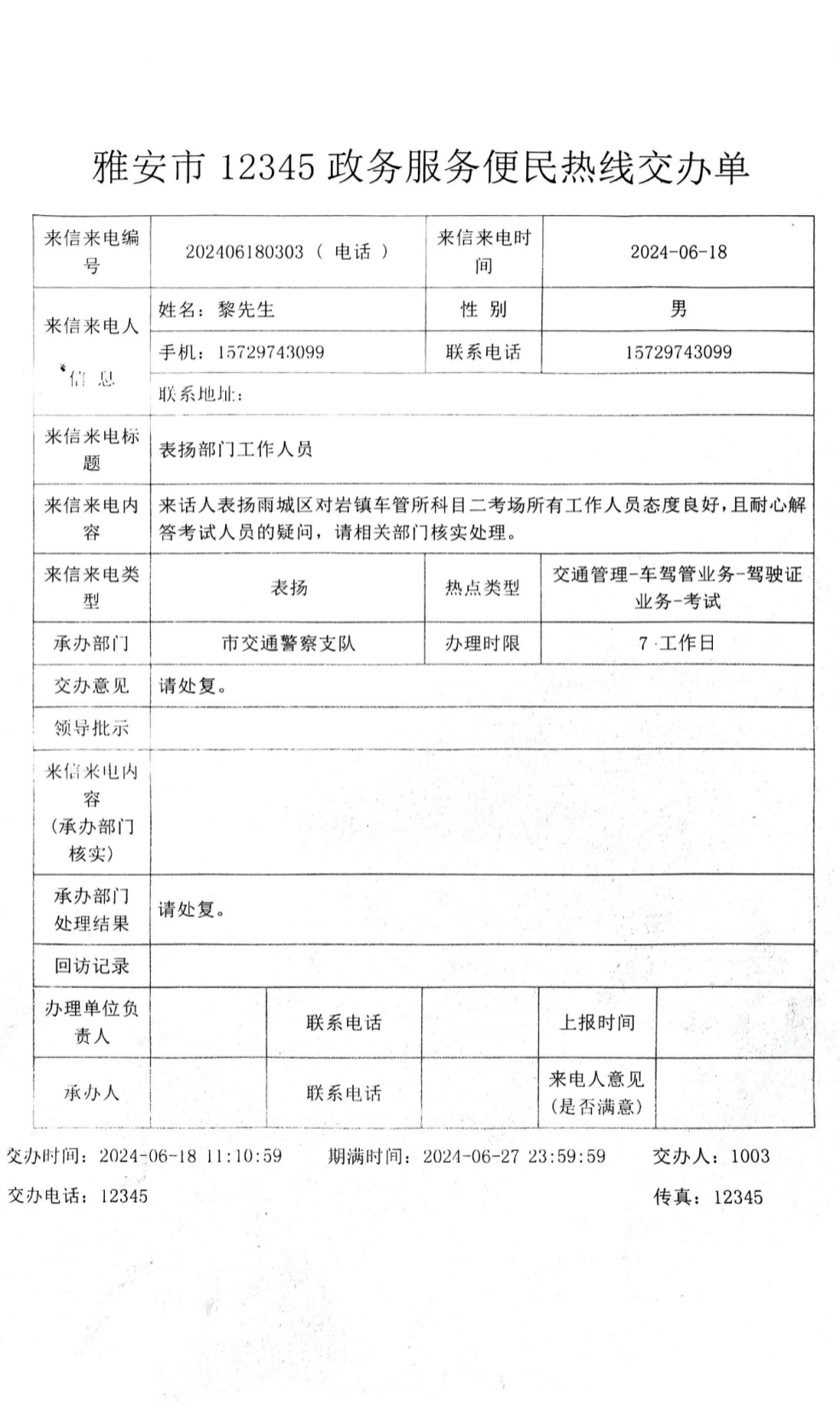 2024年6月18日,平順公司收到一封特殊的來信,市民黎先生通過“12345”政務(wù)服務(wù)便民熱線“...表揚科目二考場所有工作人員態(tài)度良好,且耐心解答考試人員的疑問...”。字里行間表達了對我公司科目二所有工作人員工作的滿意和認可。