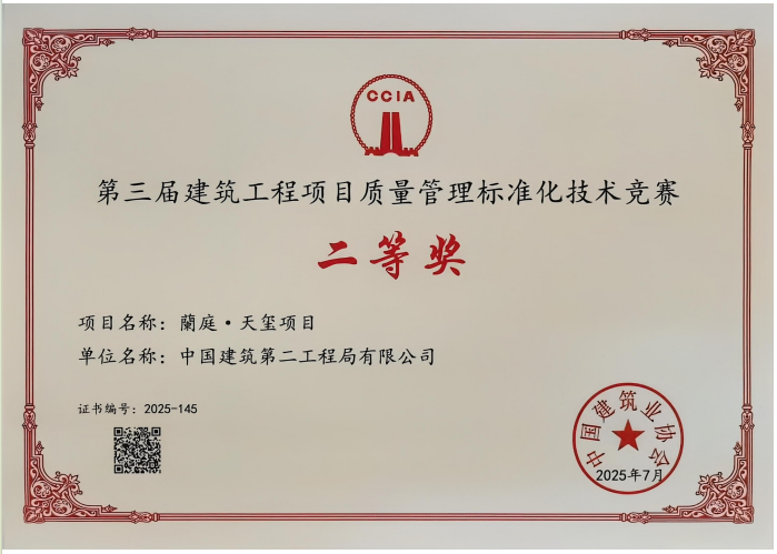 近日,交建開發(fā)公司旗下“蘭庭・天璽”項目在中國建筑業(yè)協(xié)會組織的“第三屆建筑工程項目質(zhì)量管理標準化技術競賽”中榮獲二等獎。此次獲獎,標志著“蘭庭・天璽”項目的質(zhì)量管理體系與工程實體質(zhì)量獲得了行業(yè)權威認可,為項目后續(xù)創(chuàng)建更高層次的品質(zhì)獎項積累了寶貴經(jīng)驗。