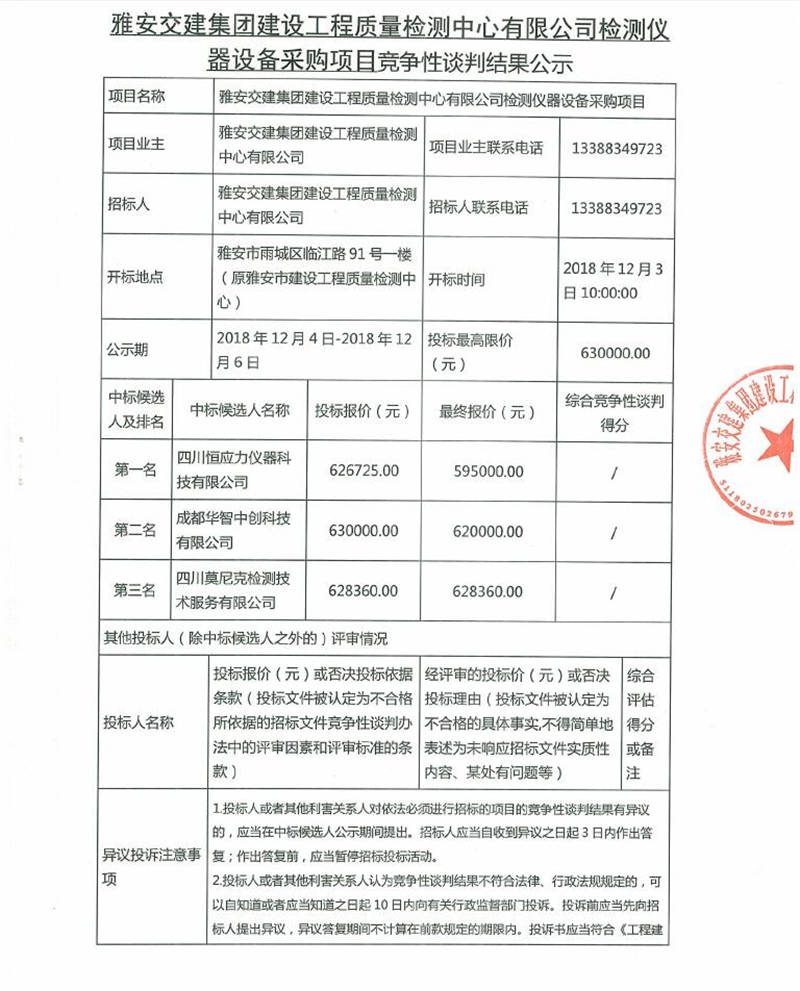 雅安交建集團建設(shè)工程質(zhì)量檢測中心有限公司檢測儀器設(shè)備采購項目競爭性談判結(jié)果公示