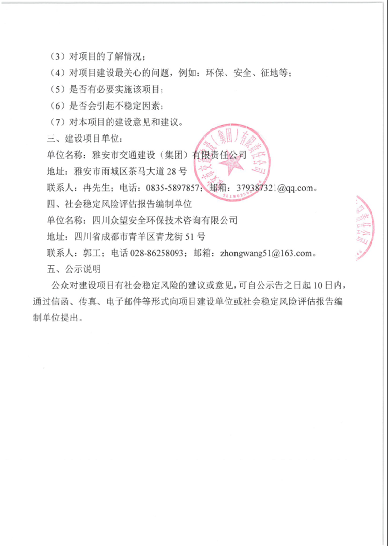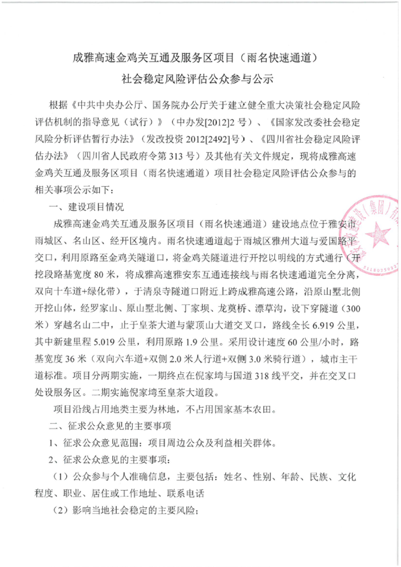 成雅高速金雞關互通及服務區(qū)項目(雨名快速通道)社會穩(wěn)定風險評估公眾參與公示