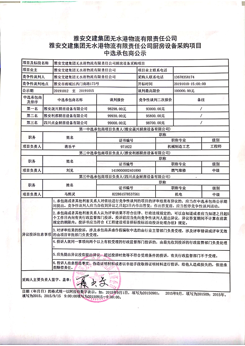 雅安交建集團(tuán)無(wú)水港物流有限責(zé)任公司廚房設(shè)備采購(gòu)項(xiàng)目中選承包商公示