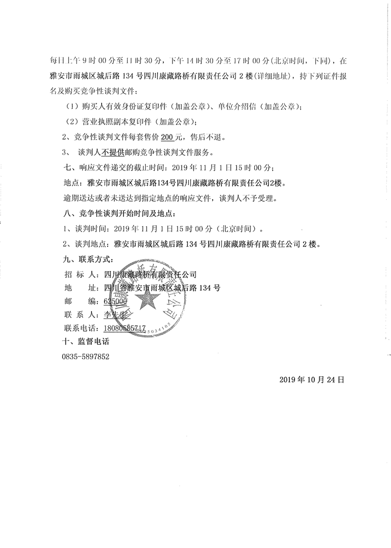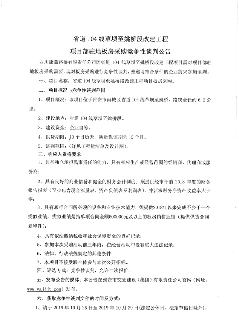 四川康藏路橋有限責(zé)任公司省道104線草壩至姚橋段改建工程項目部駐地板房采購競爭性談判公告