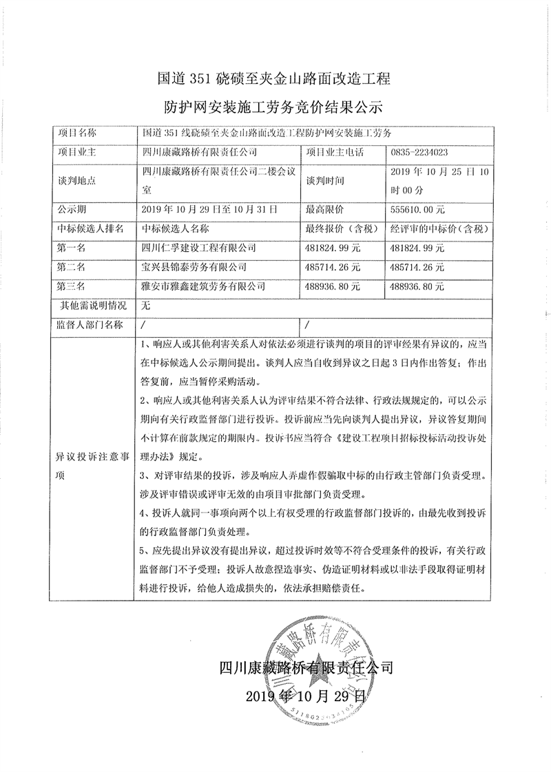 四川康藏路橋有限責(zé)任公司國道351磽磧至夾金山路面改造工程防護(hù)網(wǎng)安裝施工勞務(wù)競價結(jié)果公示