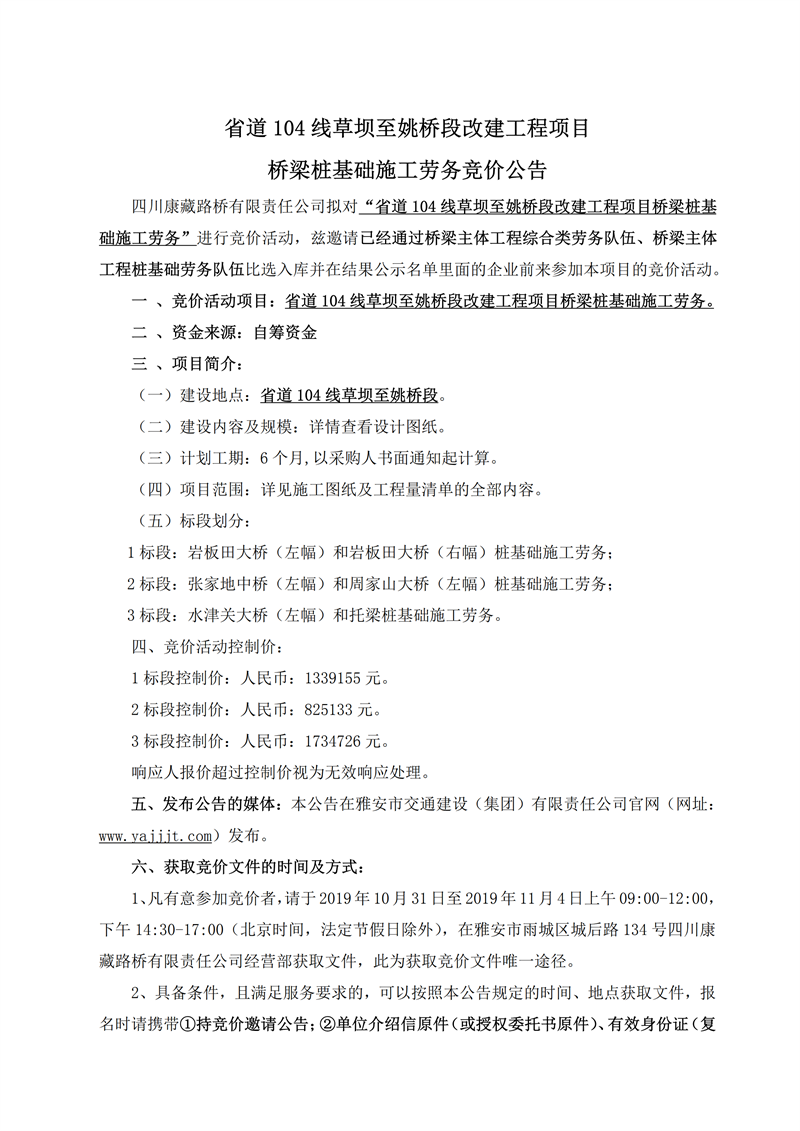 四川康藏路橋有限責(zé)任公司省道104線草壩至姚橋段改建工程項(xiàng)目橋梁樁基礎(chǔ)施工勞務(wù)競(jìng)價(jià)公告