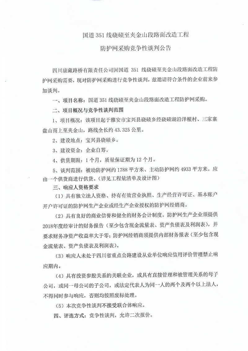 四川康藏路橋有限責(zé)任公司國(guó)道351線磽磧至夾金山段路面改造工程防護(hù)網(wǎng)采購(gòu)競(jìng)爭(zhēng)性談判公告