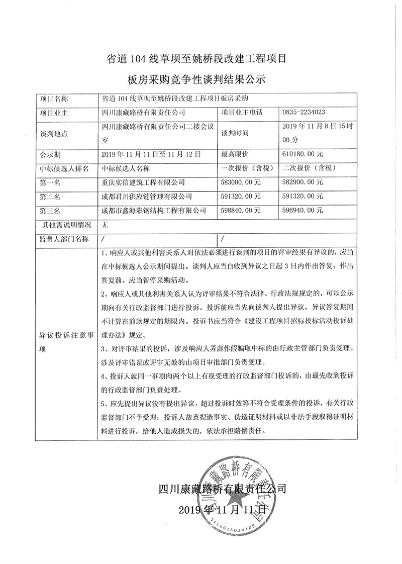 四川康藏路橋有限責任公司省道104線草壩至姚橋段改建工程項目板房采購競爭性談判結(jié)果公示