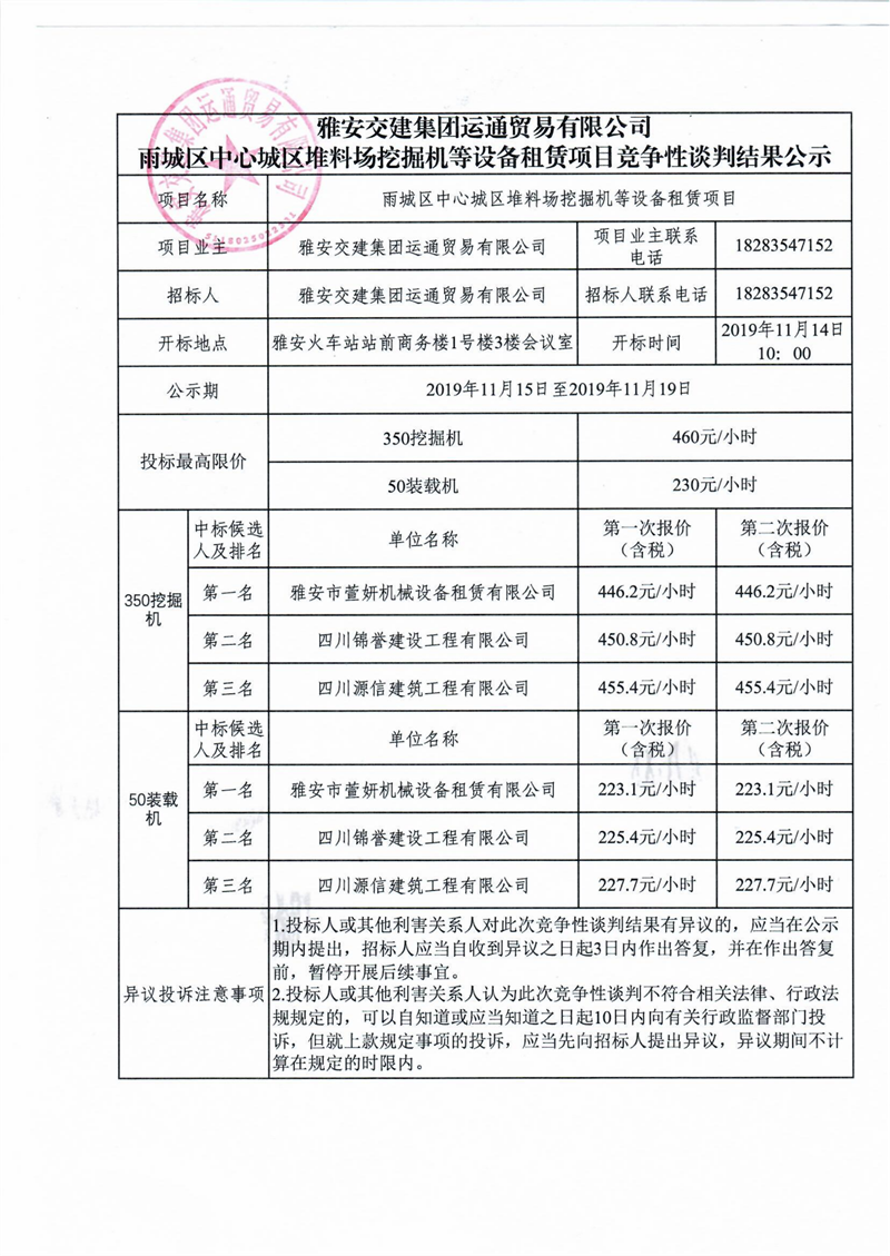 雅安交建集團(tuán)運(yùn)通貿(mào)易有限公司雨城區(qū)中心城區(qū)堆料場挖掘機(jī)等設(shè)備租賃項(xiàng)目競爭性談判結(jié)果公示