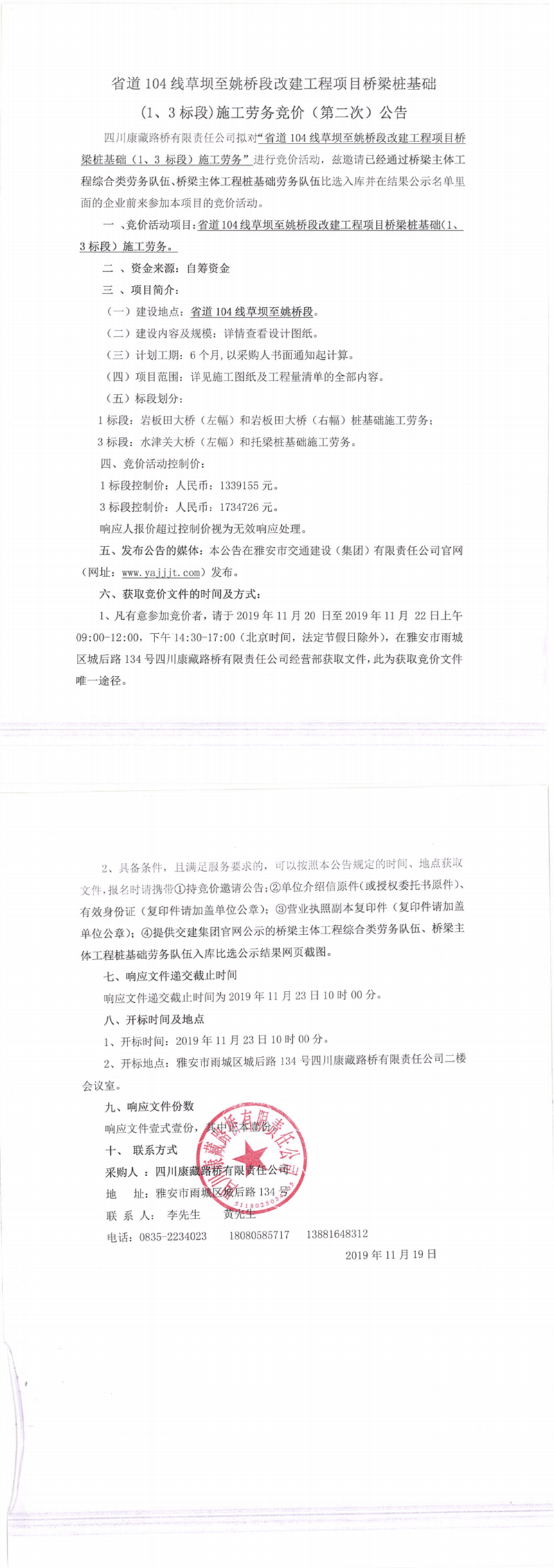 四川康藏路橋有限責(zé)任公司省道104線(xiàn)草壩至姚橋段改建工程項(xiàng)目橋梁樁基礎(chǔ)(1、3標(biāo)段)施工勞務(wù)競(jìng)價(jià)(第二次)公告