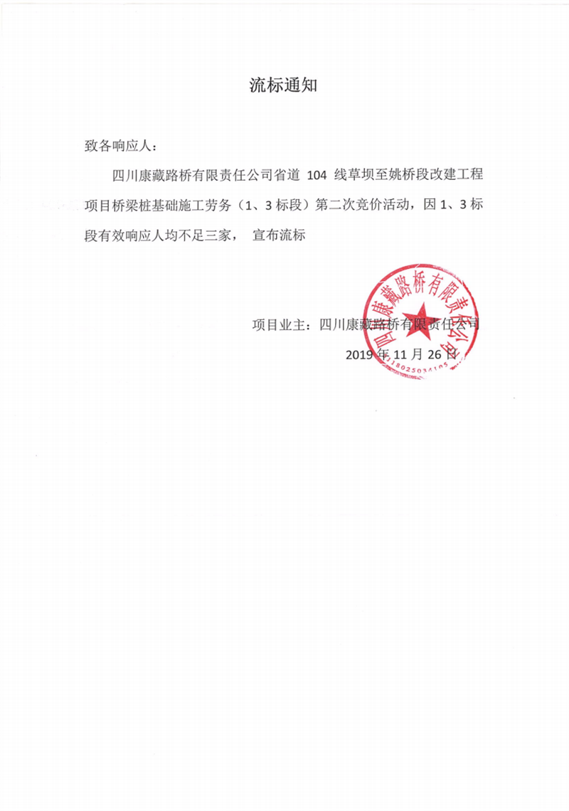 四川康藏路橋有限責任公司省道104線草壩至姚橋段改建工程項目橋梁樁基礎(1、3標段)施工勞務競價(第二次)流標通知
