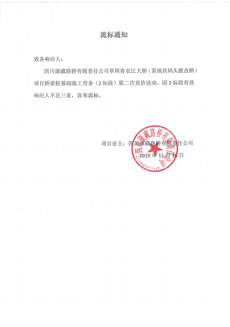 四川康藏路橋有限責(zé)任公司草壩青衣江大橋(茶地坎碼頭渡改橋)項目橋梁樁基礎(chǔ)(2標(biāo)段)施工勞務(wù)競價(第二次)流標(biāo)通知