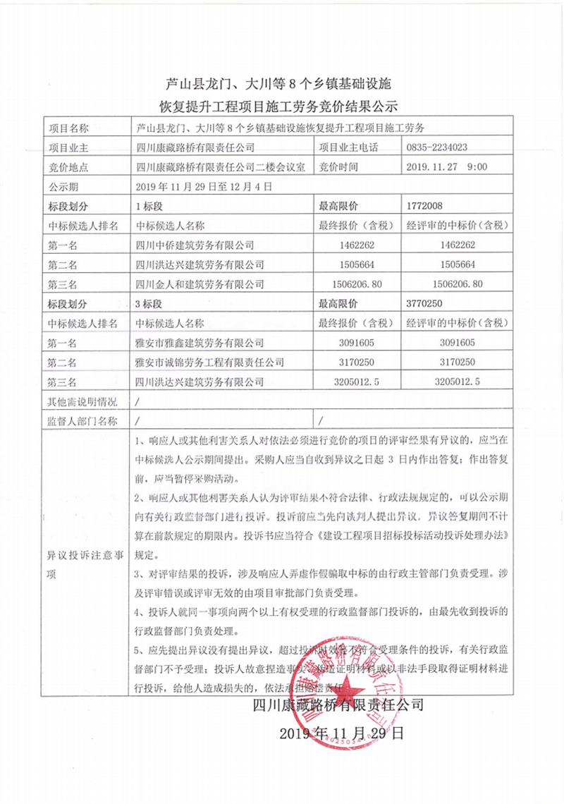 四川康藏路橋有限責任公司蘆山縣龍門、大川等8個鄉(xiāng)鎮(zhèn)基礎(chǔ)設(shè)施恢復(fù)提升工程項目施工勞務(wù)競價結(jié)果公示