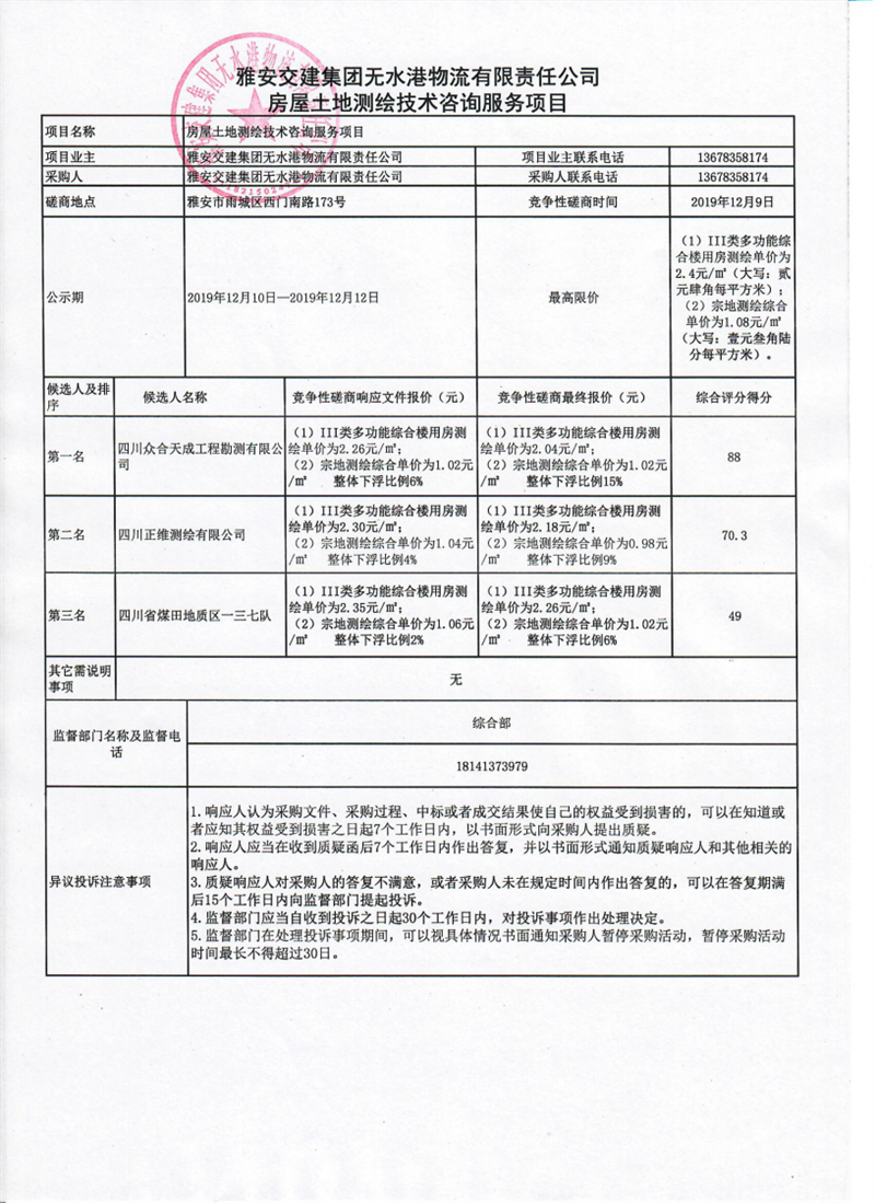 雅安交建集團無水港物流有限責任公司房屋土地測繪技術(shù)咨詢服務(wù)項目競爭性磋商結(jié)果公示
