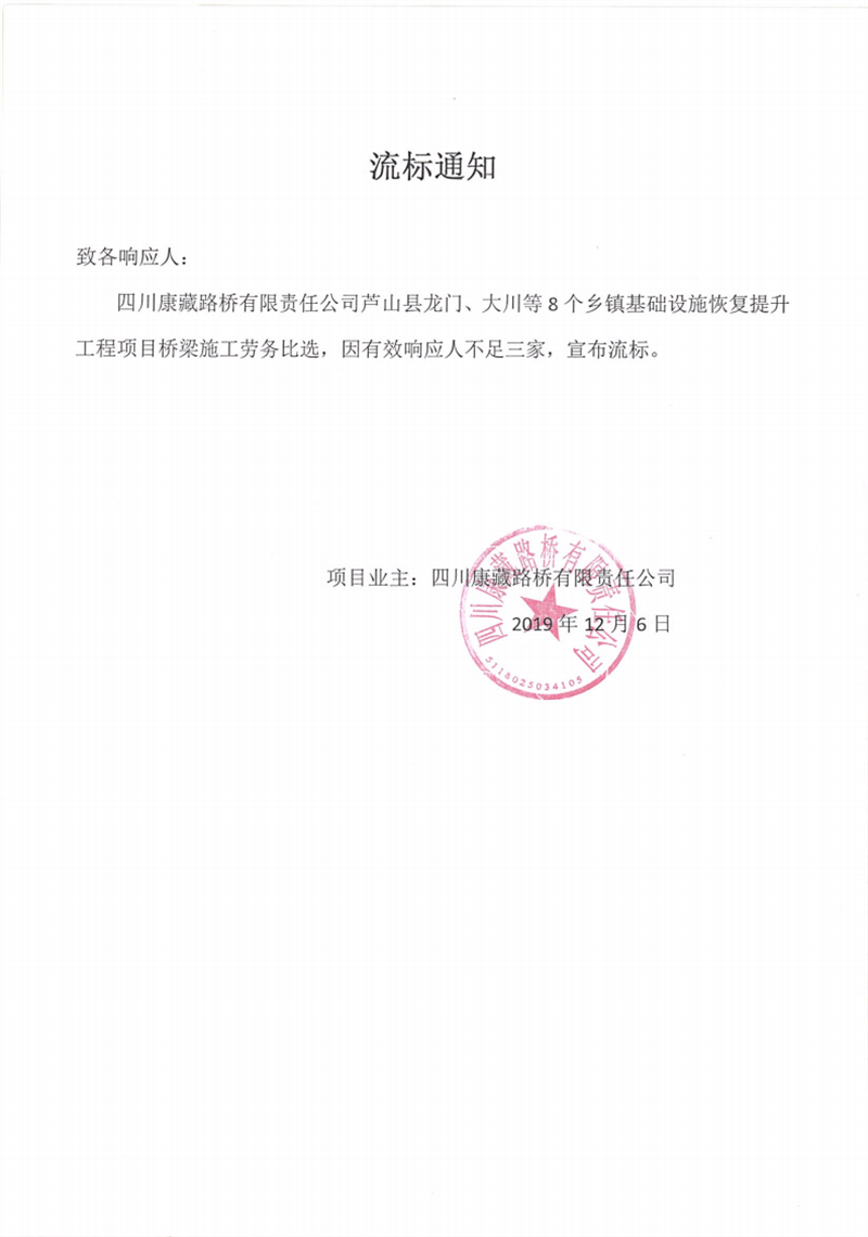 四川康藏路橋有限責(zé)任公司蘆山縣龍門、大川等8個(gè)鄉(xiāng)鎮(zhèn)基礎(chǔ)設(shè)施恢復(fù)提升工程項(xiàng)目橋梁施工勞務(wù)比選流標(biāo)通知