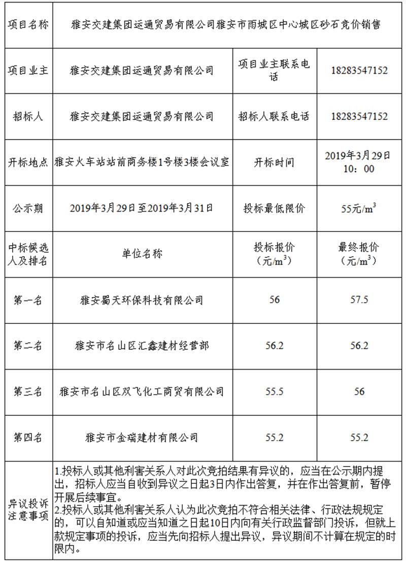 雅安交建集團(tuán)運通貿(mào)易有限公司關(guān)于雅安市雨城區(qū)中心城區(qū)砂石競拍結(jié)果公示
