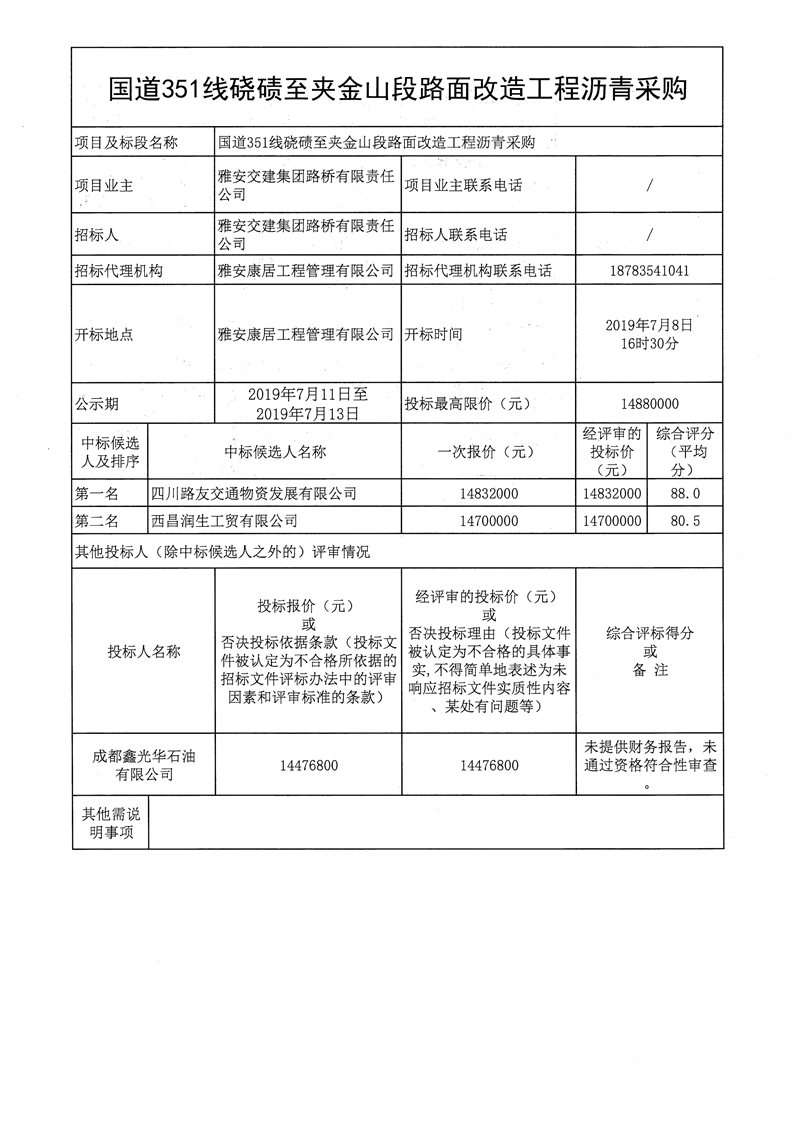 雅安交建集團(tuán)路橋有限責(zé)任公司國(guó)道351線磽磧至夾金山段路面改造工程瀝青采購(gòu)公開(kāi)招標(biāo)結(jié)果公示