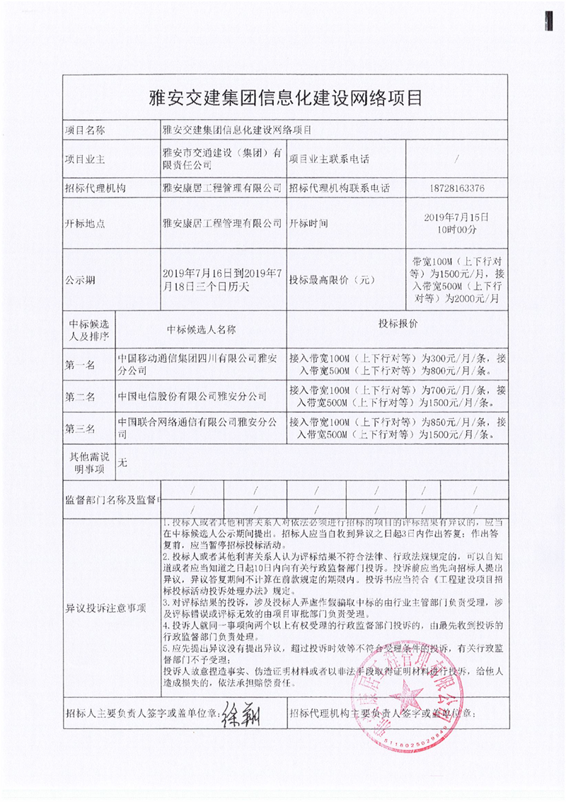 雅安交建集團(tuán)信息化建設(shè)網(wǎng)絡(luò)項(xiàng)目競爭性談判結(jié)果公示