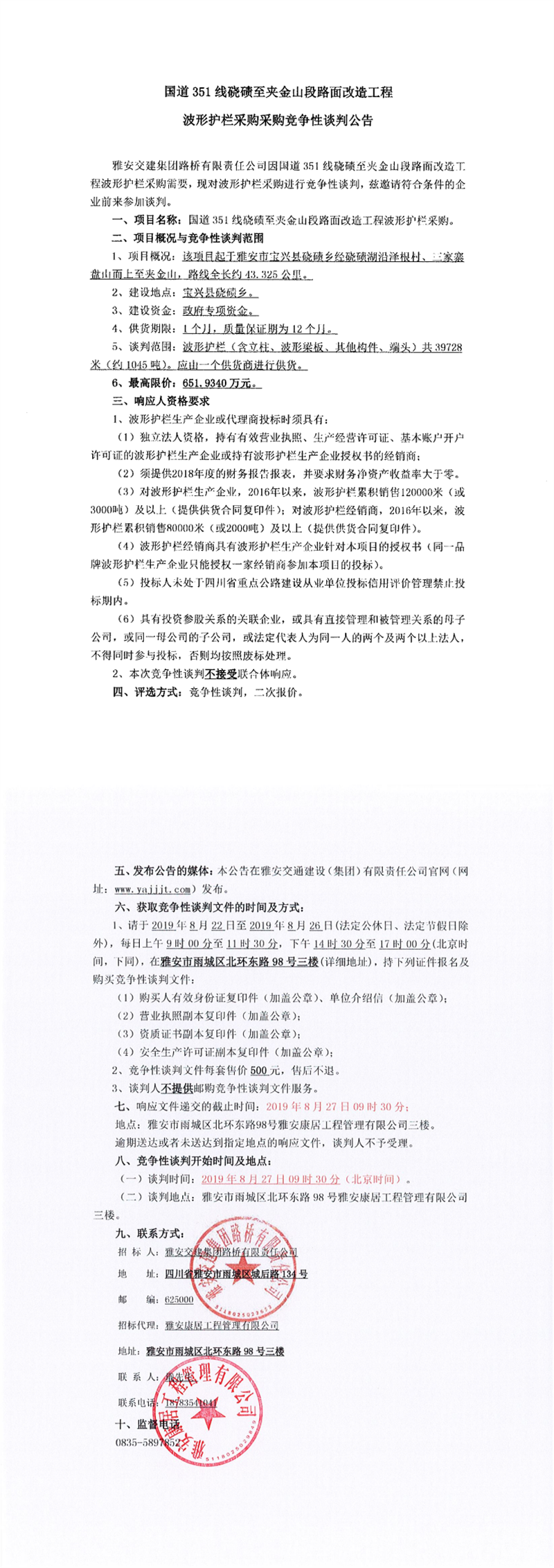 雅安交建集團(tuán)路橋有限責(zé)任公司國道351線磽磧至夾金山段路面改造工程波形護(hù)欄采購項(xiàng)目競(jìng)爭(zhēng)性談判公告