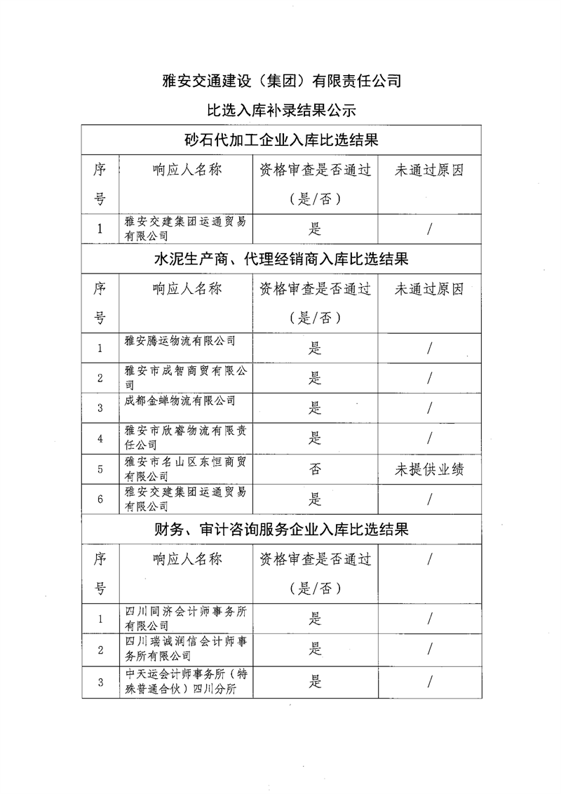 雅安交通建設(shè)(集團(tuán))有限責(zé)任公司比選入庫(kù)補(bǔ)錄結(jié)果公示