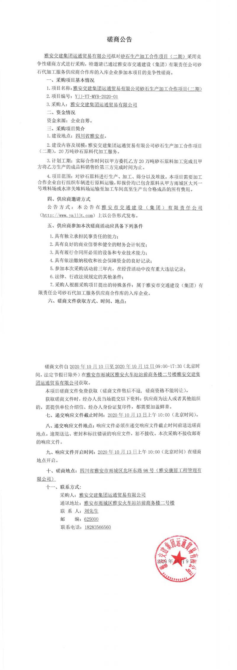 雅安交建集團(tuán)運(yùn)通貿(mào)易有限公司砂石生產(chǎn)加工合作項(xiàng)目(二期)競爭性磋商公告