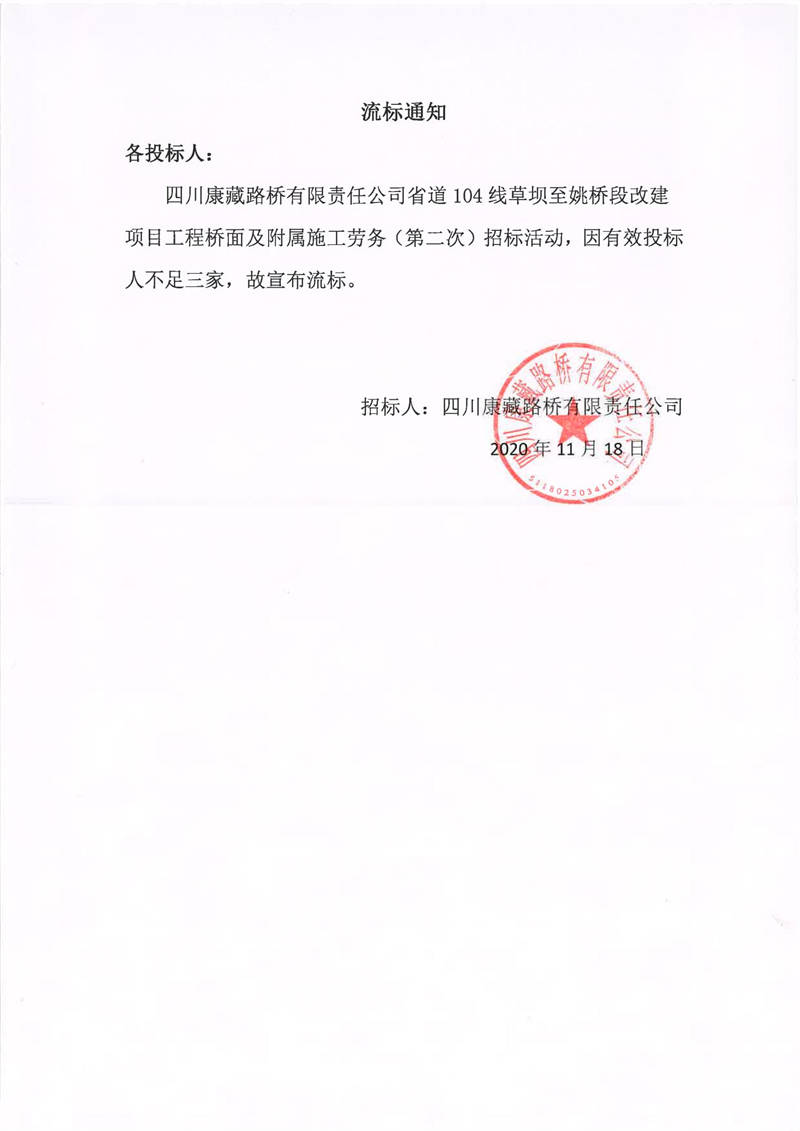 四川康藏路橋有限責(zé)任公司省道104線草壩至姚橋段改建項目工程橋面及附屬施工勞務(wù)(第二次)流標(biāo)通知