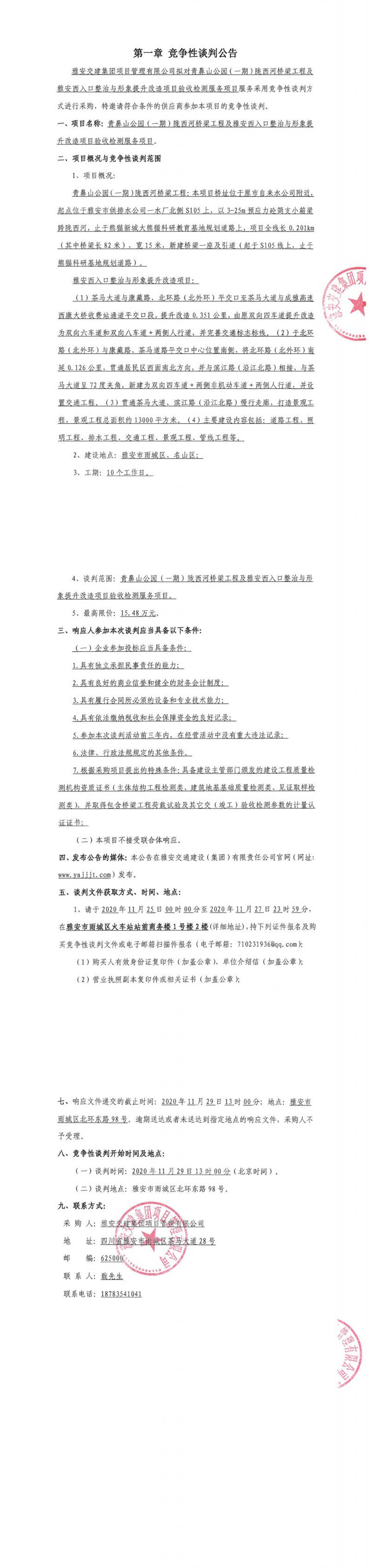 雅安交建集團項目管理有限公司青鼻山公園(一期)隴西河橋梁工程及雅安西入口整治與形象提升改造項目驗收檢測服務(wù)項目競爭性談判公告