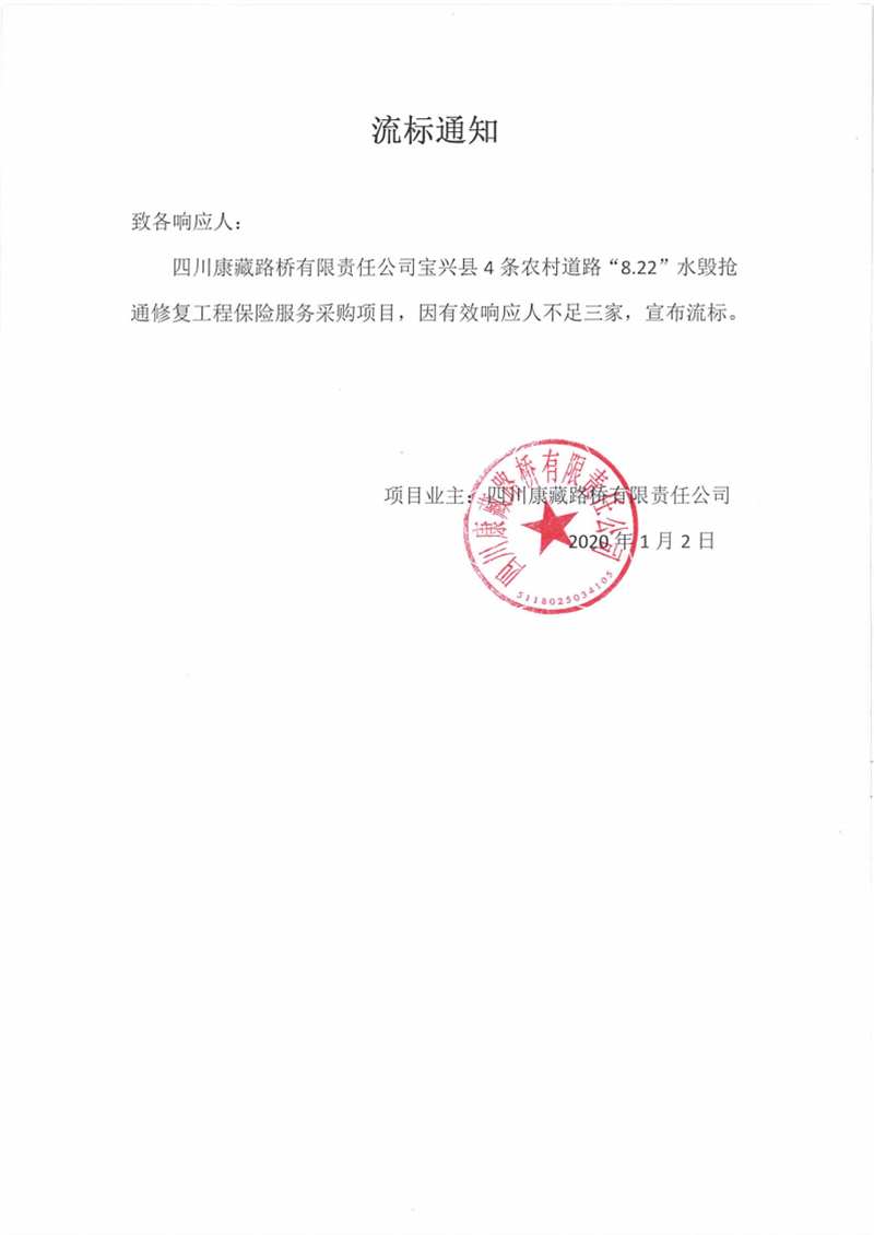 四川康藏路橋有限責任公司寶興縣4條農(nóng)村道路“8.22”水毀搶通修復(fù)工程保險服務(wù)采購項目流標通知