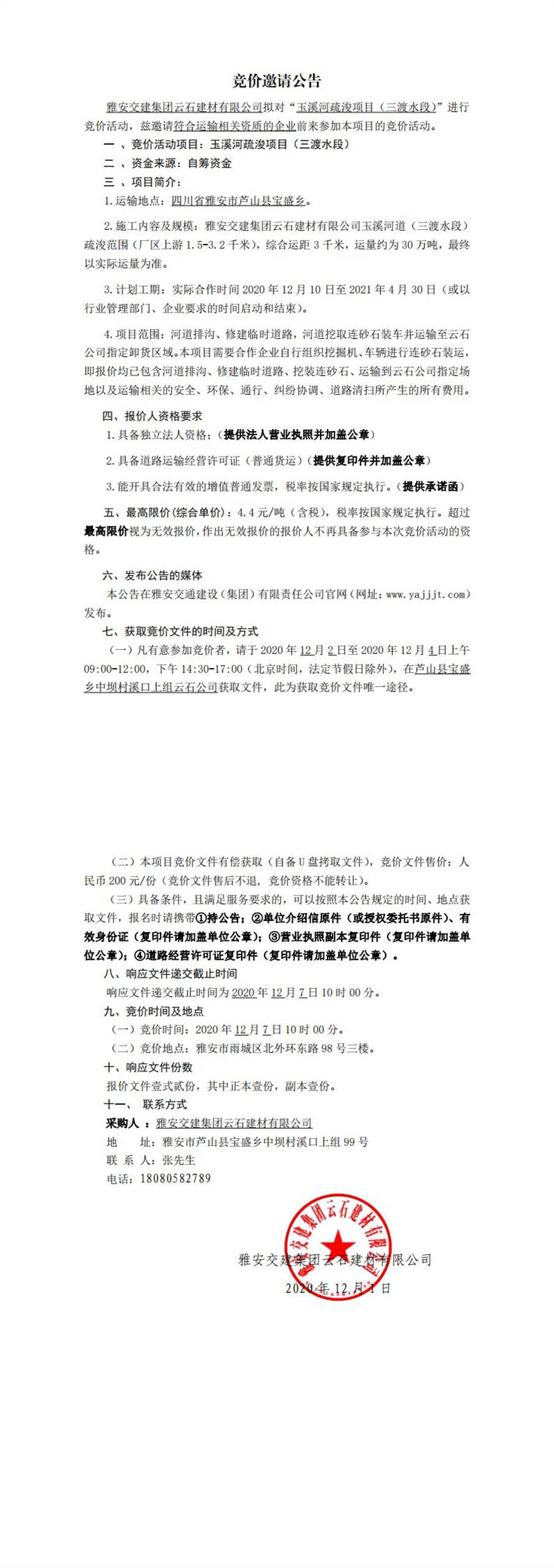 雅安交建集團(tuán)云石建材有限公司玉溪河疏浚項(xiàng)目(三渡水段)競(jìng)價(jià)公告