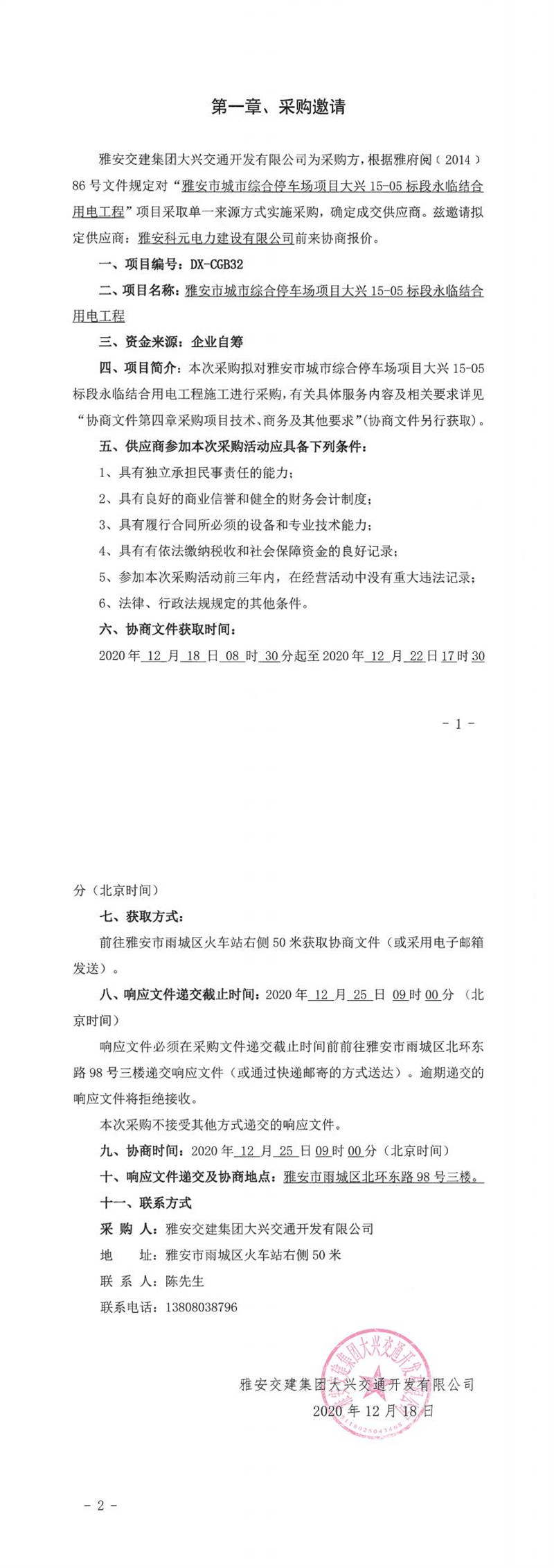 雅安交建集團大興交通開發(fā)有限公司雅安市城市綜合停車場項目大興15-05標段永臨結(jié)合用電工程單一來源采購邀請