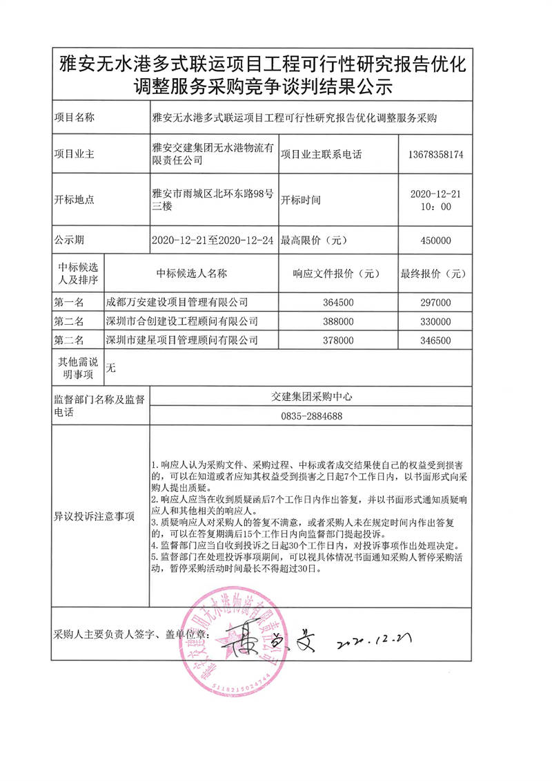 雅安交建集團(tuán)無(wú)水港物流有限責(zé)任公司雅安無(wú)水港多式聯(lián)運(yùn)項(xiàng)目工程可行性研究報(bào)告優(yōu)化調(diào)整服務(wù)采購(gòu)競(jìng)爭(zhēng)談判結(jié)果公示