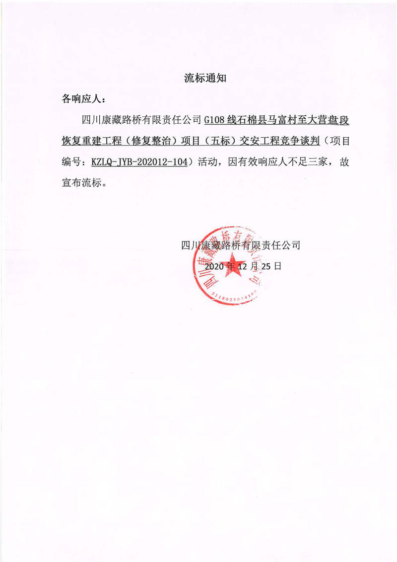 四川康藏路橋有限責任公司G108線石棉縣馬富村至大營盤段恢復重建工程(修復整治)項目(五標)交安工程流標通知
