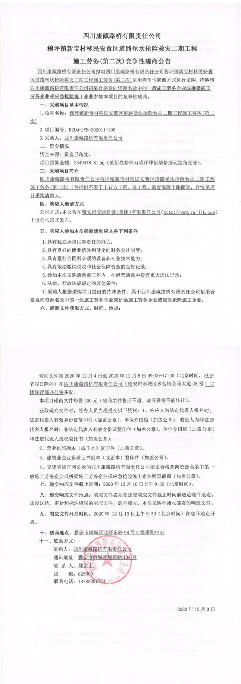 四川康藏路橋有限責(zé)任公司穆坪鎮(zhèn)新寶村移民安置區(qū)道路堡坎搶險(xiǎn)救災(zāi)二期工程施工勞務(wù)(第二次)競爭性磋商公告