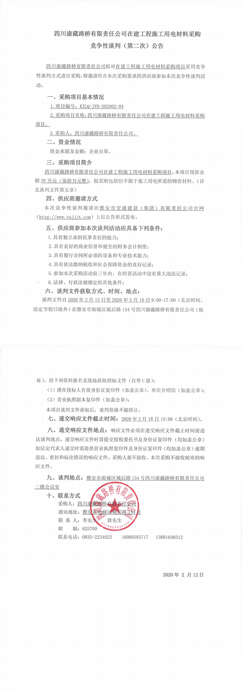 四川康藏路橋有限責(zé)任公司在建工程施工用電材料采購競爭性談判(第二次)公告