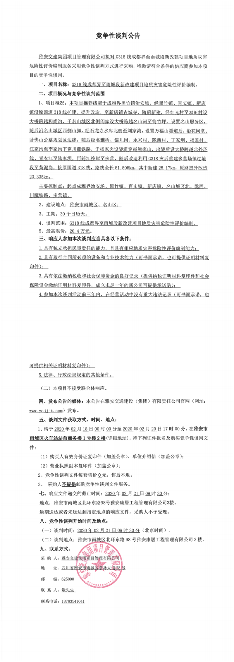雅安交建集團(tuán)項(xiàng)目管理有限公司G318線成都界至雨城段新改建項(xiàng)目地質(zhì)災(zāi)害危險性評價編制競爭性談判公告