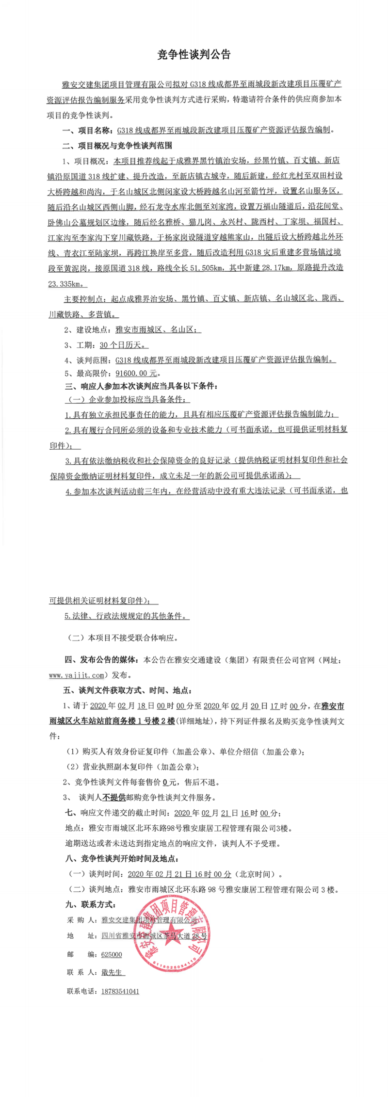 雅安交建集團(tuán)項(xiàng)目管理有限公司G318線(xiàn)成都界至雨城段新改建項(xiàng)目壓覆礦產(chǎn)資源評(píng)估報(bào)告編制競(jìng)爭(zhēng)性談判公告