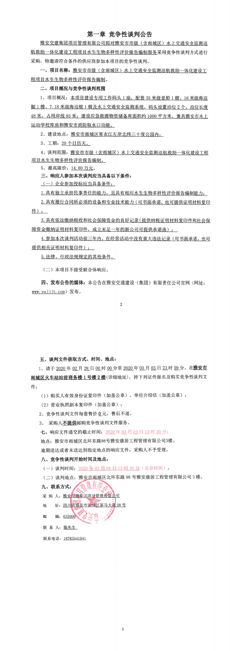 雅安交建集團(tuán)項(xiàng)目管理有限公司雅安市市級(含雨城區(qū))水上交通安全監(jiān)測巡航救助一體化建設(shè)工程項(xiàng)目水生生物多樣性評價(jià)報(bào)告編制競爭性談判公告