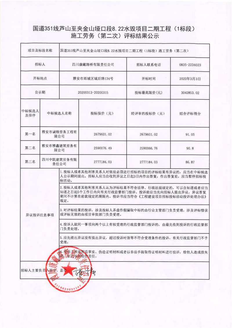 四川康藏路橋有限責任公司國道351線蘆山至夾金山埡口段8.22水毀項目二期工程(1標段)施工勞務(第二次)評標結(jié)果公示