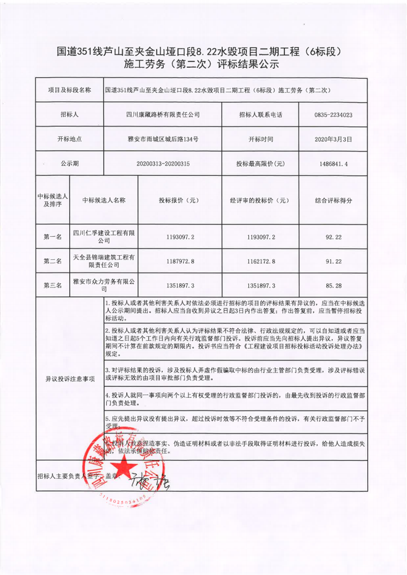 四川康藏路橋有限責任公司國道351線蘆山至夾金山埡口段8.22水毀項目二期工程(6標段)施工勞務(第二次)評標結(jié)果公示