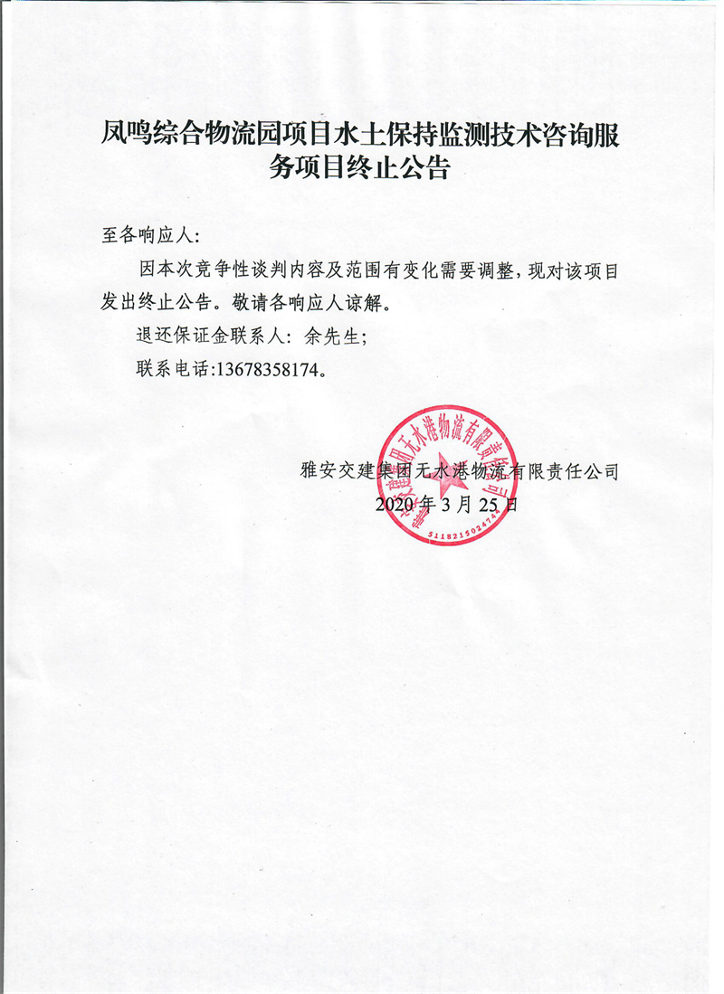 雅安交建集團無水港物流有限責任公司鳳鳴綜合物流園項目水土保持監(jiān)測技術(shù)咨詢服務(wù)項目終止公告