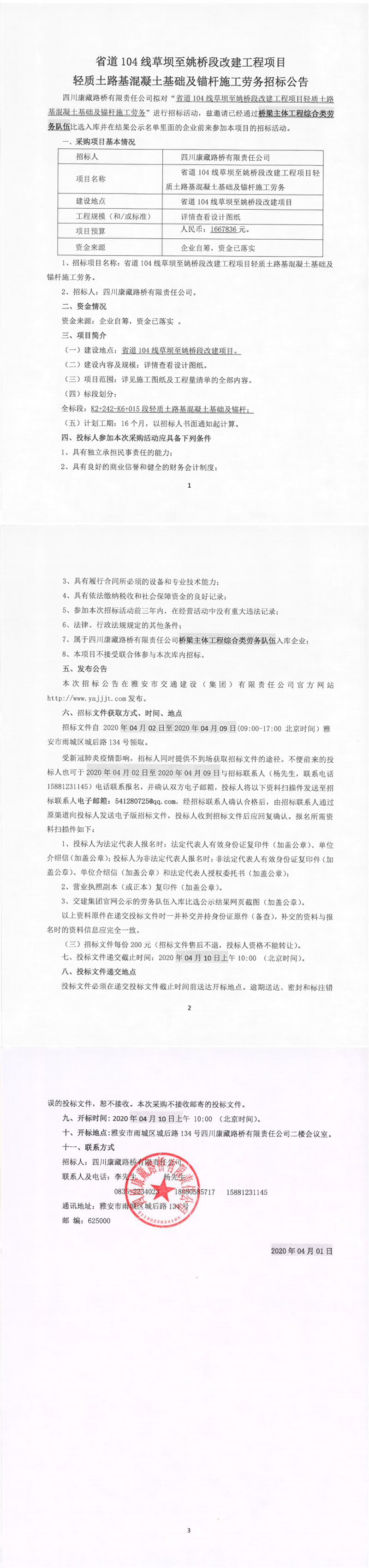 四川康藏路橋有限責(zé)任公司省道104線草壩至姚橋段改建工程項(xiàng)目輕質(zhì)土路基混凝土基礎(chǔ)及錨桿施工勞務(wù)招標(biāo)公告