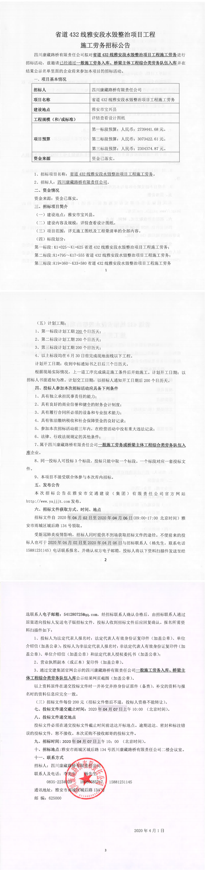 四川康藏路橋有限責任公司省道432線雅安段水毀整治項目工程施工勞務(wù)招標公告