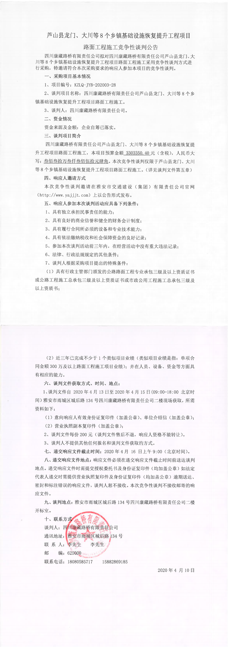 四川康藏路橋有限責任公司蘆山縣龍門、大川等8個鄉(xiāng)鎮(zhèn)基礎(chǔ)設(shè)施恢復提升工程項目路面工程施工競爭性談判公告