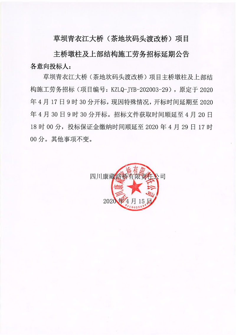 四川康藏路橋有限責(zé)任公司草壩青衣江大橋(茶地坎碼頭渡改橋)項(xiàng)目主橋墩柱及上部結(jié)構(gòu)施工勞務(wù)招標(biāo)延期公告