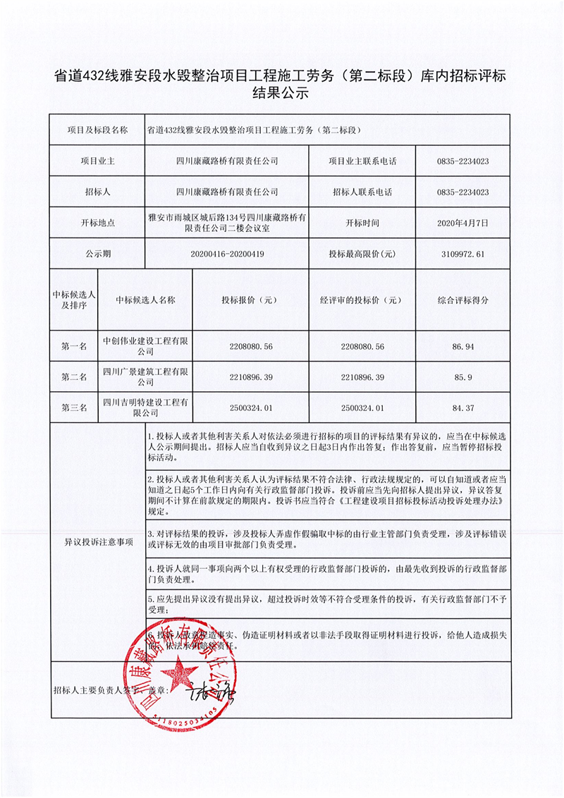 四川康藏路橋有限責(zé)任公司省道432線雅安段水毀整治項(xiàng)目工程施工勞務(wù)(第二標(biāo)段)庫內(nèi)招標(biāo)評標(biāo)結(jié)果公示